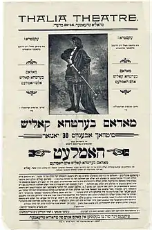 A placard for the Thalia Yiddish Theatre's production of Hamlet starring "Madam Bertha Kalish" in the title role