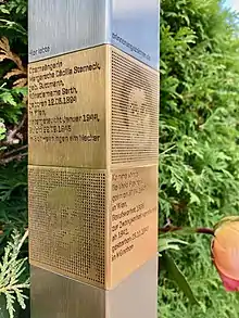 In July 2022, as part of the Memorials for Victims of the Nazi Regime in Munich project, a memorial stele was erected at Presselweg 1 (then Richthofenstrasse 1) for Berthold and Margarethe Sterneck. From 1930 he lived with his family in a villa that had to make way for a bigger building. He was the owner of the villa. In 1938 he had to sell his house.[21]