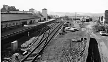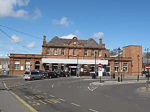 In 1847, the Great Hall of Berwick Castle had to be demolished to make way for the new station (the former West Wall of the castle still marks the boundary of the now-defunct station goods yard), which opened the following year.[1] This replaced an initial structure erected by the North British Railway, whose line from the north first reached the town in 1846.[2] The Newcastle and Berwick Railway meanwhile reached the southern bank of the River Tweed in March 1847, but it was another eighteen months before a temporary viaduct across the river was commissioned to allow through running between Edinburgh and Newcastle. This in turn was replaced by the current Royal Border Bridge in July 1850.[3] The station was rebuilt by the London and North Eastern Railway in 1927 and the buildings are Grade-II listed.[4]