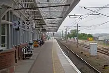 London North Eastern Railway operate an hourly service that stops here. They go southbound to London Kings Cross calling at Newcastle, Darlington and York en route. In the other direction, there are services to Edinburgh with a few extensions to Aberdeen and one extension per day to each of Glasgow Central, Stirling and Inverness.[7] CrossCountry operates an hourly service in each direction during the day on their principle Edinburgh to Plymouth route. Northbound are services mainly to Edinburgh but an extension per day to Aberdeen and Glasgow Central. In the southbound direction there are services to Plymouth via Sheffield and Birmingham New Street with a couple of extensions per day to Penzance.[8]