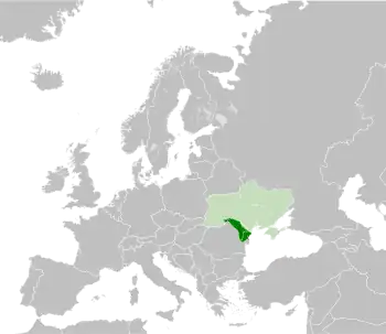 Bessarabia[lower-alpha 1] (/ˌbɛsəˈrbiə/) is a historical region in Eastern Europe, bounded by the Dniester river on the east and the Prut river on the west. About two thirds of Bessarabia lies within modern-day Moldova, with the Budjak region covering the southern coastal region and part of the Ukrainian Chernivtsi Oblast covering a small area in the north.