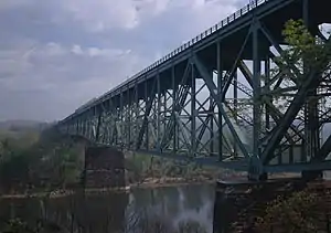 The Bessemer & Lake Erie Railroad Bridge is a truss bridge that carries the Canadian National Railway's Bessemer and Lake Erie Railroad division across the Allegheny River between the Pittsburgh suburbs of Plum and Harmar Township, Pennsylvania. In 1897, a single-track trestle and viaduct was built on this site; in 1918, the original piers were doubled in width, the current double-tracked structure built alongside, and then slid into place. The original north trestle approach was buried in slag dumped from an adjacent temporary filling trestle.[2]