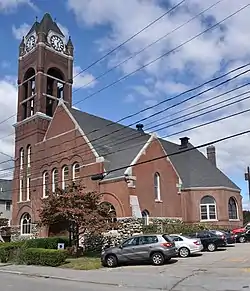 The church is located on the north side of Maple Street, just west of its junction with Moody Street. Maple Street is a major east-west route through Waltham's South Side, and Moody Street is its economic spine. The church is built principally of brick, but the lower half of the ground floor is fashioned out of uncoursed fieldstone. The gabled roof is oriented north-south, with a tall tower at the southwest corner, that has an open belfry topped by a pyramidal roof with gable-topped clock faces. The main entrance is housed inside a large round-arch opening at the base of the gabled section, and has two board-and-batten doors flanked by Romanesque windows with simple tracery.[2]