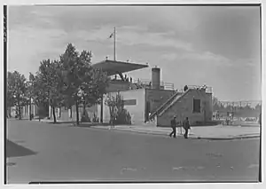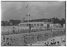 Construction for some of the 11 pools began in October 1934.[40][38] Even though there was already a pool at Betsy Head Park, Moses described its existing pool facilities as "an antiquated tank" that contained no filtration facilities; he proposed to refurbish it entirely as part of the WPA initiative.[19][20] The existing field house largely remained intact, except for some modifications to make way for an enlarged pool. The field house's lockers were replaced by baskets, and its interior was expanded so that 4,660 bathers per day could use the facilities, rather than 4,000.[41] By mid-1936, ten of the eleven WPA-funded pools were completed and were being opened at a rate of one per week.[33] Except for the Betsy Head Pool, each opening featured elaborate performances attended by La Guardia.[41] Betsy Head Park's pool was the ninth to open citywide.[42][43][lower-alpha 1] On August 7, 1936, Betsy Head Park's pool area opened without any ceremony or the mayor in attendance; over eight hundred children spread the news of the opening by word of mouth. The opening was arranged at the last minute, and the diving and wading pools were not yet complete.[44][45][46]