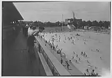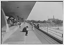 In September 1936, work started on converting the main pool to winter use, with workers temporarily draining the pool and adding basketball, handball, shuffleboard, tennis, and volleyball facilities.[41] The original bathhouse was destroyed by fire on August 17, 1937,[47][48][49] and the pool was closed for the rest of the season.[50] Park commissioner Moses's letter to La Guardia, addressed three days later, advocated for the total replacement of the bathhouse.[41] The pool area was reopened for the 1938 season,[51] with a temporary one-story structure that housed the showers. The current one-story bathhouse was opened on May 27, 1939.[41][49] By 1941, the other athletic facilities in the larger southwestern portion of the park were nearly complete.[52]