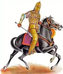 A bhuj is a type of knife or dagger from Sindh and Gujarat. It is commonly called an axe-knife, because the blade is fixed onto an axe-like haft. The weapon takes its name from the city of Bhuj in the Kutch district of the state of Gujarat, where it originated, though it may have also originated in Sindh.[1] The bhuj is short, broad, stout, and heavy, with a mild curve. It often sports an engraved and gilded mount, inlaid haft and decorated knob. This knob is typically a stylized elephant head, giving the weapon the nickname elephant knife. The short re-curved blade measures 7–10 in (180–250 mm) long, and its copper sheath makes the weapon 20 in (510 mm) long in total. It is mostly single-edged, except for a slight rear edge at the tip. The blade is mounted at a right angle to a metal haft in a manner similar to a long axe. The haft is sometimes hollow, concealing another small stiletto-like dagger. The weapon is similar to the Punjabi gandasa or the European glaive. The weapon was popular among the Sindhi cavalry of the Soomra and Samma dynasties of Sindh.