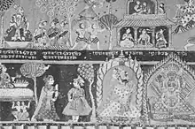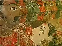 The construction of this palace was completed in 1708 after which Bhupatindra Malla had a Chitrakar paint frescoes on the second floor.[117] The walls on the second floor of the palace are painted with Paubha paintings depicting various religious scenes and the portraits of the royal figures.[117][28] The central fresco contains a portrait of Vishvarupa and his consort.[65] The Vishvarupa has multiple layers of head while the mythical Mount Meru forms the background.[117] The central head of the Vishvarupa has the face of Bhupatindra Malla.[65][117] On one of the eyebrows of the figure, the snake king and his army of serpents is seated.[117] Similarly, on the two shoulders of the Vishvarupa stands Ganesha and Kumara while the chest of the Vishvarupa contains a scene from the Ramayana where Rama and his allies are seated in a golden chariot and are fighting a ten headed Ravana and his army.[117] A lotus plant sprouts from the navel of the Vishvarupa, where the creater deity Brahma is seated.[117] Brahma is being attacked by demon forces of Madhu and Kaitavya and is being defended by Shiva and his divine army.[117] Similarly, the Vishvarupa is embracing a female figure who has a white complexion and a distinctive nevus on her chin, identifying her as Queen Vishva Lakshmi.[117] Similarly, her ribbon which forms an elaborate headwear contains the word 'Sri Bhupatindra' written in the Newari script, further identifying her as Bhupatindra's queen.[65][117] Vishva Lakshmi is embracing her consort with her left arm while her right arm which holds a golden cup, contains a gold bangle the upper part of which has been modified into the figure of a blue coloured Bhairava and his consort Bhairavi.[117] The Vishvarupa painting although heavily damaged has been described as the epitome of Nepalese painting and one of the rarest in the world.[117] Historian Purushottam Lochan Shrestha further writes that: