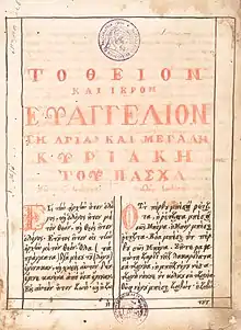 In 1852 Pavel Bozhigrobski printed the first four pages of the Konikovo Gospel in Solun.[10] In the original the language was not named, but in the version published by Bozhigrobski he calls it "Bulgarian".[11][12][13][14] The printed version was republished in transcription in 1917, 1922 and 1931 by Bulgarian researchers.