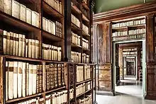 By 1715, the library's collection had increased to 7,487 books.[6] During the eighteenth century, Giuseppe Garampi, Prefect of the Vatican Archives, was a notable donor to the library.[6][7] He frequented the library as a sixteen-year-old boy,[4][6] and in later life, he deposited many incunables and codices, including a De Civitate Dei written for the Malatestas.[5][6] He bequeathed the library 27 incunables upon his death in 1792, including a first edition of Roberto Valturio's De re militari and 86 codices.[6][7] Local historians consider Garampi's contribution to the Gambalunghiana as crucial to Rimini's renewal, led by his teacher, Giovanni Bianchi, as a cultural centre rather than isolated provincial town.[5]