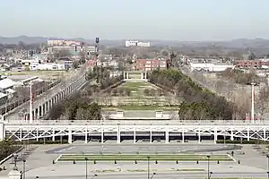 In the late 1950s and early 1960s, a building boom resulted in several skyscrapers being constructed around the capitol building.[16] The view to the north, however, remained unobstructed, and a movement arose to preserve this.[2] The state began gradually acquiring much of the land north of the capitol in the early 1970s with the intent of eventually constructing a large office complex, necessitated by the growth in the size of the state government.[17] In 1985, Nashville landscape architect Joe Hodgson suggested redeveloping the land north of the state capitol into a public park, which was echoed by John Bridges of Nashville-based Aladdin Industries in 1988.[3] On July 19, 1989, then-Governor Ned McWherter suggested that the land to the north of the capitol be converted into a linear green space modeled on the National Mall in Washington, D.C., with the intent of opening to the public for the state's bicentennial.[17][18] On November 7, 1991, the Metropolitan Nashville Council approved a revitalization plan for downtown Nashville, which included the mall.[3]