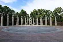 Directly north of this is the Tennessee Amphitheater, a 2,200-seat terraced amphitheater used for special events.[10] It is patterned off of the Ancient Theatre of Epidaurus.[7] The northern end of the park features the Court of 3 Stars, a circular plaza made of red, white, and blue granite arranged in the tri-star logo found on the Flag of Tennessee. These stars represent the three Grand Divisions of Tennessee. Surrounding the plaza are 50 columns containing a 95-bell carillon, representing the 95 counties of the state and the state's contribution to the development of American popular music.[1][9] The carillon plays a part of the Tennessee Waltz every fifteen minutes, and the entire song each hour.[7] A 96th bell housed on Capitol Hill joins in at the top of each hour; the bell is meant to represent the government’s commitment to the people.[7]