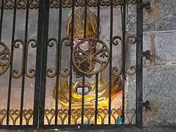 The legend states that Bienheuré fasted and prayed before fighting the dragon. According to the legend, the dragon was so large that when it went to drink from a river at some distance away, its tail still lay in its cave. It was also so large that it drained the Loir when it drank from it.[6] There are three versions of this combat: the first states that the dragon fled at the sight of Saint Bienheuré; the second version states that Saint Bienheuré defeated the dragon with one blow from his staff; the third states that the dragon strangled itself with its chain.[6]