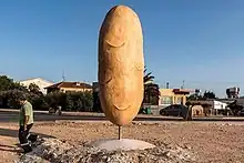 The statue cost €8,000 to create and is located at the centre of Xylofagou, commemorating the potato-growing history of Xylofagou and the villages around it. It was created ahead of the annual local potato festival. It is shaped after the Spunta potato breed, which is grown in the village and is famous for its abnormally long shape.[2] It is guarded at night to prevent vandalism. Tasou stated that he was inspired by The Big Fish in Belfast, and wanted to commemorate Xylofagou's potato history in a similar way.[3] The Deputy Ministry of Tourism in Cyprus welcomed the project.[4] The statue was pushed over by vandals on 1 January 2022 at around 3:30 am,[5] causing €4,000 in damages.[6][7] It was confirmed to not be weather-related,[8] though the perpetrators were never caught despite a €500 reward for information.[9][10]