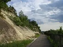 An outcropping of sandstone topped by limestone along the river bluffs