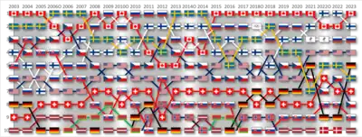 - ↑ Note that the rankings include the final ranking of two non-national teams that participated in the tournament: Team North America and Team Europe. Were these teams not to be factored in to the final ranking, Sweden would have placed 2nd, Russia 3rd, the Czech Republic 4th, the United States 5th, and Finland 6th.