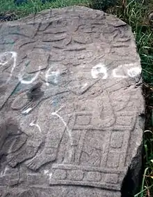 Monument 21 is a basalt boulder in a sugarcane field. The boulder has an artificially flattened upper surface bearing a bas-relief sculpture. The carved face has a 35° slope and measures 11 by 13 feet (3.4 by 4.0 m). The sculpture depicts three main figures. The central figure is the largest and faces towards a second figure seated on a throne. The third figure is behind the central figure, it is smaller and holds a hand puppet. The scene is filled out with twisting vines that sprout cocoa pods bearing human faces. Other details of the monument include birds, snakes and a butterfly with a human head. Monument 21 has been dated to the Classic period.[5] Monument 21 is located east of Mound 2, in the centre of Group B.[35] The decoration on the skirt of one of the figures may be the face of the central Mexican deity Xipe Totec.[13]