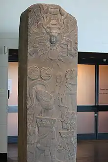 Monument 3 depicts a larger ballplayer figure and a smaller death god, both of whom are wearing ballgame yokes, standing in front of a temple. The ballplayer is offering a human heart to the sun.[31] The monument was found in the Monument Plaza but was removed to the Ethnological Museum of Berlin.[30]