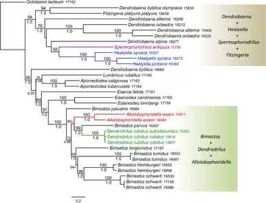 - ↑ Domínguez J, Aira M, Breinholt JW, Stojanovic M, James SW, Pérez-Losada M (February 2015). "Underground evolution: new roots for the old tree of lumbricid earthworms". Molecular Phylogenetics and Evolution. 83: 7–19. doi:10.1016/j.ympev.2014.10.024. PMC 4766815. PMID 25463017.