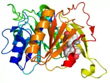 Crystallographic structure of the HsaC extradiol dioxygenase from M. tuberculosis (rainbow colored, N-terminus = blue, C-terminus = red) complexed with 3,4-DHSA (space-filling model (carbon = white, oxygen = red).[1]