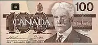 Robert Borden is featured on the obverse of the brown $100 banknote, which has the Canada goose on its reverse.[11] Yves Baril also engraved this portrait, and the banknote also depicts a vignette of the Centre Block with the Peace Tower flying the Union Jack, which was flown on all federal buildings from 1904 to 1945.[27]