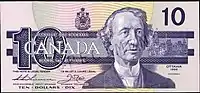 The prime minister featured on the $10 banknote obverse is John A. Macdonald, whose portrait was engraved by Thomas Hipschen of the Bureau of Engraving and Printing in the United States.[22] Adjacent to the portrait is a vignette of the buildings of Parliament as they were during his premiership, flying the Canadian Red Ensign.[22] The bird featured on the reverse is an osprey.[11] The purple banknote was introduced on 27 June 1989 and withdrawn on 17 January 2001.[23]