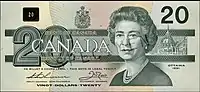 The green $20 banknote has an obverse featuring Elizabeth II, the same engraving used for the $2 banknote,[22] and a reverse featuring two common loons.[11][24] The building vignette adjacent to the portrait is the Library of Parliament.[22] The image of the loons was intended for a $1 banknote, but when it was decided to replace that with the $1 loonie coin, the image was instead used for the $20 banknote.[22]