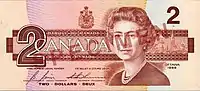 The $2 banknote has an obverse featuring Elizabeth II, the Queen of Canada at the time of its introduction on 2 September 1986.[16][3] A photograph by Anthony Buckley was the basis of the portrait, which was engraved by Henry S. Doubtfire of De La Rue.[17] Adjacent to the portrait is a vignette of the Parliament buildings.[17] The reverse of the terra cotta banknote features American robins.[3] This note would be the last Canadian $2 banknote, as the government announced during the 1995 Canadian federal budget speech that it would be withdrawn from circulation.[18] It was withdrawn on 16 February 1996 and was replaced by a $2 coin, colloquially referred to as the toonie.[2]