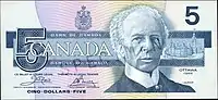 The obverse of the blue $5 banknote included a rendering of Wilfrid Laurier, and the bird on the reverse is the belted kingfisher.[11] The portrait was engraved by Yves Baril, and to its right is a vignette of the Centre Block as it appeared during Laurier's premiership flying the Canadian Red Ensign, the flag of Canada at the time.[17]