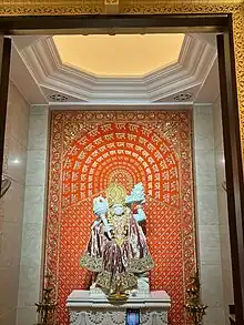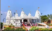 The temple is built in a Nagara style, and has five shikharas (temple towers). The main deities worshipped here are the divine couple Radha Krishna.[2]