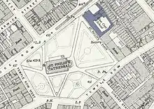 The school was founded on 16 November 1722 as a charity school under the guidance of Reverend William Higgs, Rector of St Philip's Church, now Birmingham Cathedral.[1] At its outset, it provided food, clothing and education to 32 boys and 20 girls from poor families, aged between nine and 14.[2] Construction of a plain brick building took place in 1724 and was significantly enlarged 70 years later in 1794, which included addition of the stone facade which is present today. Figures of a boy and a girl are placed at either side of the building, sculpted by Edward Grubb. Most of the children who were originally admitted were either orphans or who had lost a parent, with the school often assuming the role of guardian for those children. Records from 1884 showed an enrollment of 141 boys and 88 girls.[1]
