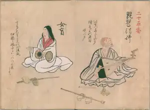 Itinerant women performers did still exist in medieval Japan, though they are most frequently shown playing the tsuzumi drum.[32] In the Edo period, singers called goze often accompanied themselves on the shamisen or koto, the latter of which was played by "affluent blind women who taught it to the wives of samurai and merchants".[31] The former along with its wooden imitation, gottan were played for performance to procure alms, house to house; this was called kadozuke (門付).[32] In Kyushu, goze were not uncommon with such performers mentioned in the Tōdō's late-18th-century accounts.[32] Although not bona fide members of the guild, goze held annual festivals, and this profession continued to be viable into the mid-1900s.[32]