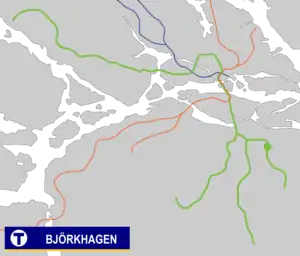 Björkhagen metro station is on the green line of the Stockholm metro, located in Björkhagen, Söderort. The station was inaugurated on 18 November 1958 as a part of the extension from Hammarbyhöjden to Bagarmossen.[2] The distance to Slussen is 4.8 km (3.0 mi).
