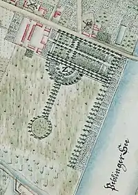 Map detail that shows the tree-lined driveway that led up to Blågård from present-day Nørrebrogade