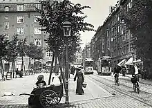 The so-called Demarcation Line which restricted the construction of buildings in the area was moved from Jagtvej to Peblinge Lake in 1852 and the street received its current name in 1859. The teacher training college Blaagaard Seminarium was founded in rented rooms in Blågårdsgade in 1859 and a purpose-built building was inaugurated at No. 15 in 1863. The street was first built over with lower and more scattered buildings but with taller apartment blocks in the 1880s. The street was part of a working-class neighbourhood and also developed a city-wide reputation as a shopping street.[1] The city acquired the iron foundry site in 1898 and established Blågårds Plds to improve the area. Tram line No. 3 operated through the street in both directions between 1906 and 1949.