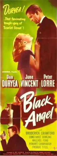 Black Angel is a 1946 American film noir starring Dan Duryea, June Vincent and Peter Lorre. Directed by Roy William Neill, it was his final feature film. Produced by Universal Pictures, it is set in Los Angeles and broadly adapted from Cornell Woolrich's 1943 novel, The Black Angel.