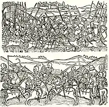 - ↑ Several sources differ whether a siege, sparse fightings, or retreat caused by famine occurred during the Polish-Hungarian conflict. Caused and followed by an internal revolt of Hungarian nobles and religious leaders led by Janus Pannonius, János Vitéz, and Emeric Zápolya. Casimir IV of Poland was invited and supported by the rebelling nobles so he stepped in and sent his son Casimir as a pretender to the Hungarian throne. He was promised Hungarian reinforcement as the nobles were to join him when he crossed the border. He led his army of 12,000 men towards Kassa where he was about to take the city without resistance. Meanwhile, Matthias was able to settle his dispute with the rebelling factions and convinced them to take his side. The parties agreed and so did Zápolya along with Nicolaus Chiupor de Monoszló who stopped the approaching Polish invasion from attempting to besiege Kassa by taking the city before him and fortifying themselves in. The prince turned to Nitra instead and occupied it. Matthias arrived there to liberate the city with his army of 16,000 mercenaries and banderias (banners). From this point on, the events are unclear; what is sure is that Casimir retreated with an escort cavalry and the rest of the Polish main forces were released shortly after. Finally the conflict was settled in the Treaty of Ófalu[75] Contemporary historians' presentations differ on the causes of the outcome. Italian historian Antonio Bonfini commissioned by Matthias refers to it as being a siege, which resulted in heavy loss for the besieged due to famine for the first wave. He states that the second wave of Poles was slaughtered by peasants and citizens while marching home, while the prince fled days before, after meeting Matthias and had been spared by him.[76] Hungarian Johannes de Thurocz agrees while adding that a counterattack followed the events where Hungarians attacked the counties of Zemplén and Sáros still under Polish possession and drove them out and intruded into Poland as well for prowling (it is worth noting that these events show remarkable similarities to those that took place two years later).[77] While Polish historian Jan Długosz argues that the incursion happened upon invitation and that no state of war came into existence. He recalls the nobility's actions as betrayal and Casimir's steps as aid or some sort of help for the counts of Hungary. He also questions the circumstances of the retreat claiming it was a peaceful return after Casimir IV met with the Pope Sixtus IV's emissary in Kraków who intervened and urged the maintenance of peace.[78] Based upon the aforementioned, the causes of retreat might be (any or multiple):