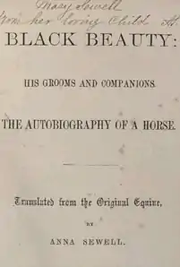 - ↑ Unti, Bernard (1998). "Sewll, Anna". In Bekoff, Marc (ed.). Encyclopedia of Animal Rights and Animal Welfare. Greenwood Press. p. 313. ISBN 0-313-29977-3.