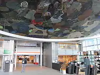 The Danish artist Per Kirkeby has created a 210 square metre titleless fresco at the entrance to the lending section and reading rooms at level C. The painting is one of the largest ceiling decorations in the Nordic countries and it took Per Kirkeby more than a year to complete. Executed in oils, the colourful and organic painting creates a striking contrast to the minimalist surroundings and the adjacent cleavage in glass and steel.