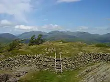 Black Fell is the high point in the hilly area bounded by Windermere, Langdale and Coniston. It occupies an area of around one mile by two, clad mainly in fell grass with many small outcrops of rock. Despite its modest altitude Alfred Wainwright accorded Black Fell a chapter in his Pictorial Guide to the Lakeland Fells, partly due to its excellence as a view point. It represents the perimeter of the Lakeland Fells proper in his opinion, the land to the south falling within his supplementary volume, The Outlying Fells of Lakeland. Later guidebook writers have also included Black Fell within their remit.[1][2]