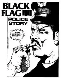 Another image which drew considerable attention was the artwork created for the "Police Story" single, showing a police officer being held with a gun in his mouth with the speech blurb "Make me come, faggot!" The image was plastered on flyers all around Los Angeles and added to the police pressure on the band.[69] Pettibon later remarked that "my values are relativistic, and I'll give a cop the benefit of the doubt. If that's me with my gat – my gat's larger than the one depicted – we can have a discussion, and he can answer me just as well with my .357 barrel in his mouth, or on his cheek, or on his adenoids, or down his throat. I'll listen to his whimpering cries."[75]