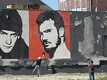 Black Flag's visual imagery and artwork complemented the themes found in the band's music. Greg Ginn's brother Raymond Ginn, under the pseudonym Raymond Pettibon, created the artwork for all of the band's studio releases with the exceptions of Damaged and the "TV Party" single, as well as providing artwork for the band members to transform into merchandise and gig flyers.[70] When the band found it necessary to change their name from Panic in 1978, it was Pettibon who suggested the new name Black Flag and designed their iconic logo: four vertical black rectangles comprising a stylized rippling black flag. The logo evoked a number of meanings: it was the polar opposite of a white flag of surrender, as well as a symbol for anarchism and a traditional emblem of pirates.[71] At the same time, Rollins disavowed the claim that the logo represented anarchy, stating in a 1985 interview that it means "Anything that you want it to. I guess it's the opposite of the white flag too, which is the flag of surrender. A lot of people think that it means 'Anarchy' but it doesn't."[72]