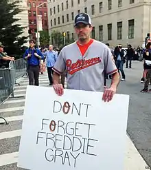 A demonstrator raising awareness of the death of Freddie Gray in Baltimore, April 2015
