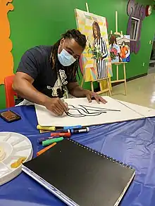 Nathaniel Rhodes ("B" artist) displays art during a 2021 Black History Month public program at The Children's Museum of Indianapolis.