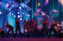 A scene in the music video, where Aespa is seen in a neon-colored virtual reality flanked by a group of female backup dancers.