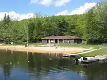 The sandy beach on Black Moshannon Lake is open from Memorial Day weekend through Labor Day weekend, and the beach bathhouse was built by the CCC.[37] Beginning in 2008, lifeguards will not be posted at the beach.[58]