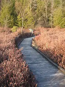 • Bog Trail is a 0.5-mile (800 m) boardwalk hiking trail that was built by the Pennsylvania Conservation Corps and has received awards for its handicapped accessibility.[35] Bog Trail loops through the bog at the park passing by lilies, sedges, rushes, Leatherleaf, and various carnivorous plants. Visitors may observe waterfowl and wildlife in the bogs.[19] Access for the handicapped is provided at the boating area.[12]