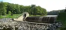 The lake, as seen from the PA Route 504 bridge, is made possible by the underlying sandstone.