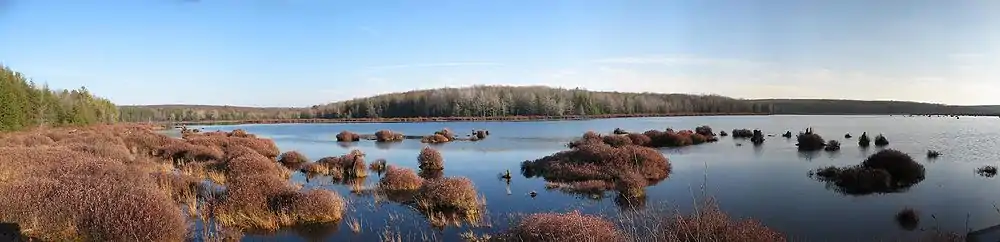 Black Moshannon State Park is a 3,480-acre (1,410 ha) Pennsylvania state park in Rush Township, Centre County, Pennsylvania, United States. It surrounds Black Moshannon Lake, formed by a dam on Black Moshannon Creek, which has given its name to the lake and park. The park is just west of the Allegheny Front, 9 miles (14 km) east of Philipsburg on Pennsylvania Route 504, and is largely surrounded by Moshannon State Forest. A bog in the park provides a habitat for diverse wildlife not common in other areas of the state, such as carnivorous plants, orchids, and species normally found farther north. As home to the "largest reconstituted bog in Pennsylvania", it was chosen by the Pennsylvania Department of Conservation and Natural Resources for its "25 Must-see Pennsylvania State Parks" list.[7]