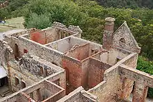 The fires resulted in two deaths, destroyed 40 homes and numerous other buildings, and caused more than A$4 million worth of property damage, most notably the destruction of the Governor's summer residence at Marble Hill. Governor Robert George, his family and staff were lucky to escape with their lives. The Premier, Sir Thomas Playford, also narrowly escaped death, sheltering with five other men in a patch of hoed earth near Cherryville.[5] The burnt area was estimated at as much as 160,000 hectares (600 sq mi) stretching from One Tree Hill to Strathalbyn;[1] however, other sources put the area at closer to 39,000 hectares (150 sq mi).[2]