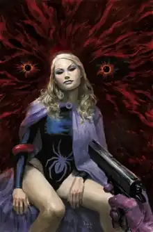 Before her transformation, Claire Voyant has undefined psychic powers enabling her to communicate with the spirits of the dead. Resurrected by Satan as the Black Widow, the character has been granted supernatural powers. She uses them to harvest the souls of evildoers for Satan. Claire Voyant has a death touch power.[28][29] Her targets are instantly struck dead and their soul is sent to Hell. She leaves a mark in the shape of a spider on the victims she has touched. She possesses superhuman strength. She can alter her appearance. The character is able to generate fire. She is able to teleport between Hell and the mortal world at will.[30] She has the power to heal others. Claire Voyant has the ability to fly. The character is shown to be bulletproof.[31] Additionally, Satan states he has made the Black Widow immortal.[32]